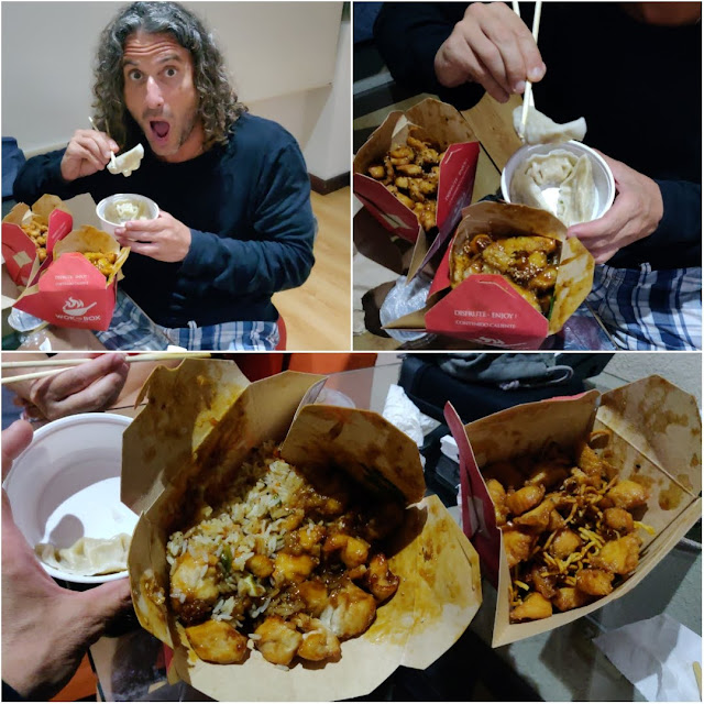 Para cenar, wok de pollo con arroz y wok de pollo con pasta crujiente; además de unas gyozas para acompañar. La verdad es que sólo con un box, habríamos tenido más que suficiente. ¡Cené demasiado! 😔